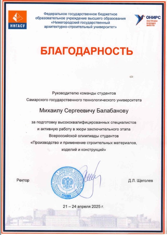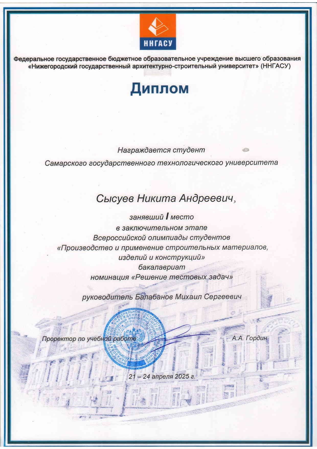 В апреле 2025 г. в Нижегородском государственном архитектурно-строительном университете состоялся Всероссийский (заключительный) этап олимпиады «Производство и применение строительных материалов, изделий и конструкций», в котором приняли участие 33 студента из 10 городов России. Среди них был студент 4 курса кафедры ПСМИК СТФ Самарского Политеха, группы 21СТФ-105 – Никита Сысуев.